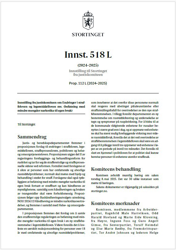Stortinget ber regjeringen, innen våren 2026, utrede og sende på høring et lovforslag som sikrer at politiet ikke straffeforfølger narkotikaovertredelser etter legemiddelloven og mindre alvorlige overtredelser av straffeloven § 231, der lovbryteren yter assistanse, er til stede eller tilkaller nødetater i akutte nødsituasjoner, eller der en slik overtredelse avdekkes hos fornærmede ved anmeldelse av andre straffbare forhold, med sikte på deretter uten unødig opphold å komme tilbake til Stortinget med et lovforslag.